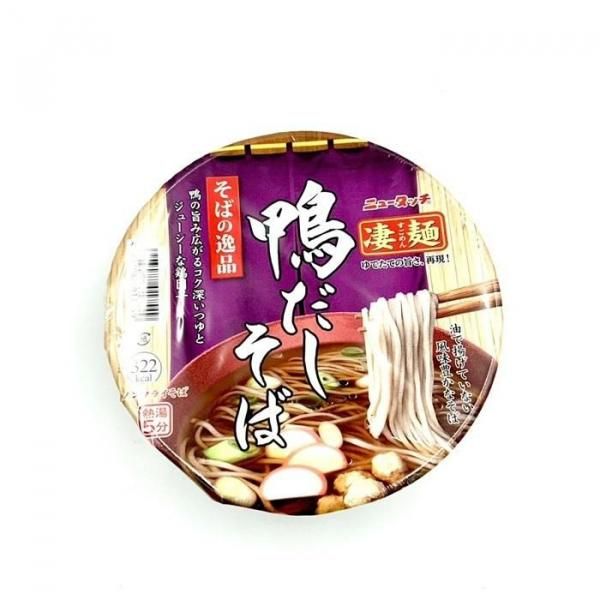 挽きたてのそば粉を使用した風味豊かなノンフライそばと鴨肉を炙ったような風味が効いたつゆ、このつゆによく合うジューシーな鶏肉団子が入ったカップ麺です。